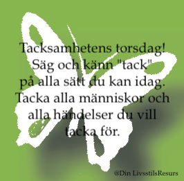 Dagens visdomsord: Tacksamhetens torsdag! Säg och känn ”tack” på alla sätt du kan idag. Tacka alla människor och alla händelser du vill tacka för.